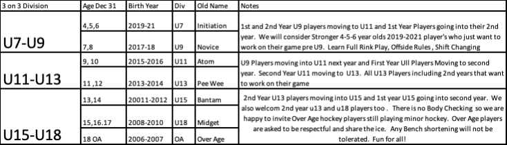 Welcome back to 3 on 3 for Spring 2026 We are pleased to offer our very popular 3 on 3 league to players’ birth years 2021-2008. League will include 8 games Full Ice with Referee and Score Keeper